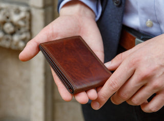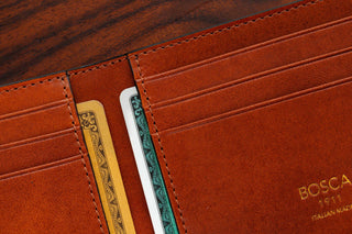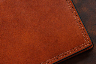 The profile of this wallet is small, but the feature list is huge, including six card pockets to handle your ID and all of your debit, credit, loyalty, and business cards. There are also two additional stash pockets for your receipts and other necessary items, and a center cash well for all of your paper bills. The allure of this wallet, however, is the leather. We constructed this bifold using our signature Dolce leather. Dolce in Italian means sweet, soft, luscious, and smooth. The rich stain highlights the natural grains and textures of the veg-tanned leather. We then polish the leather to a low luster resulting in a semi-gloss finish.