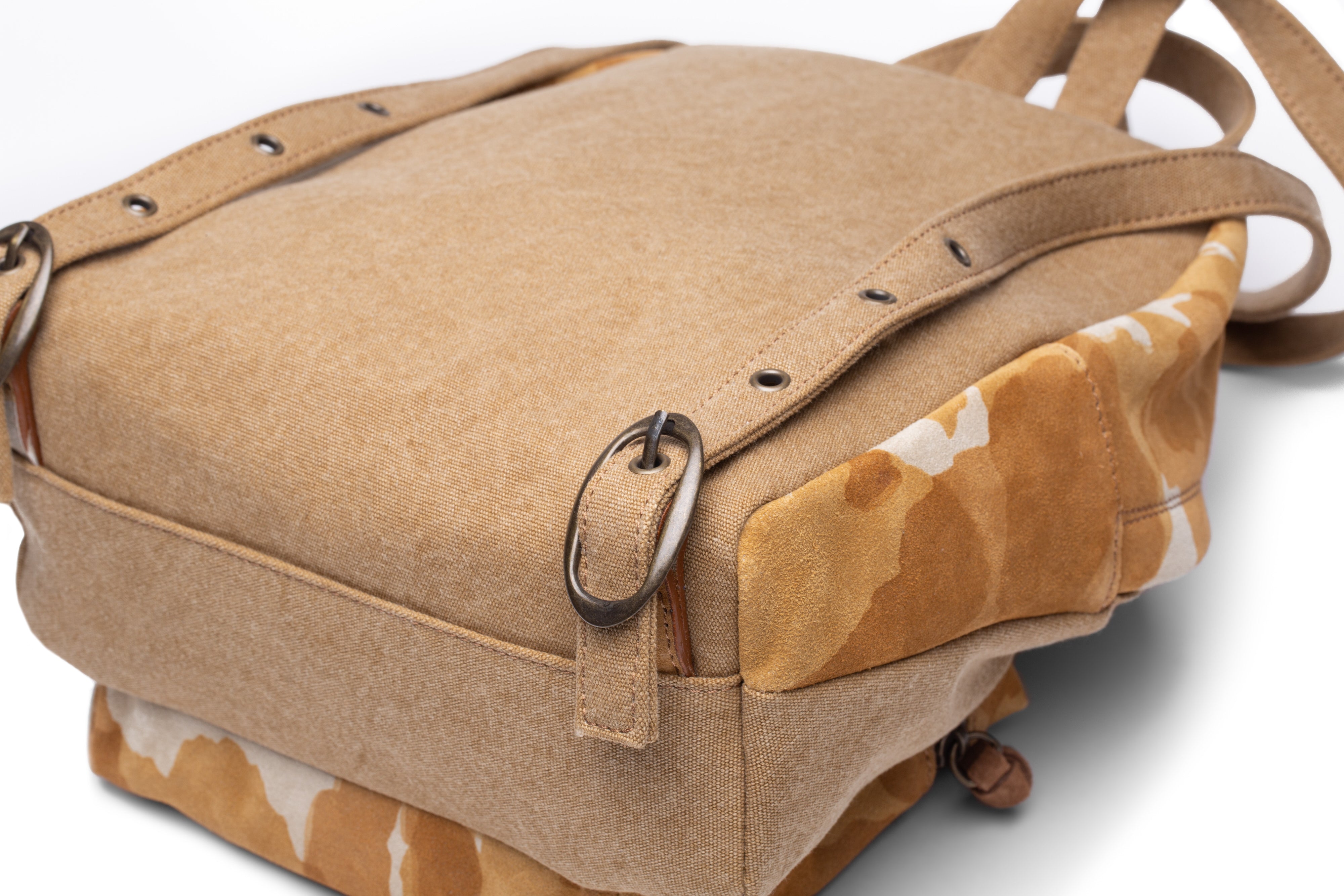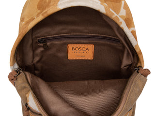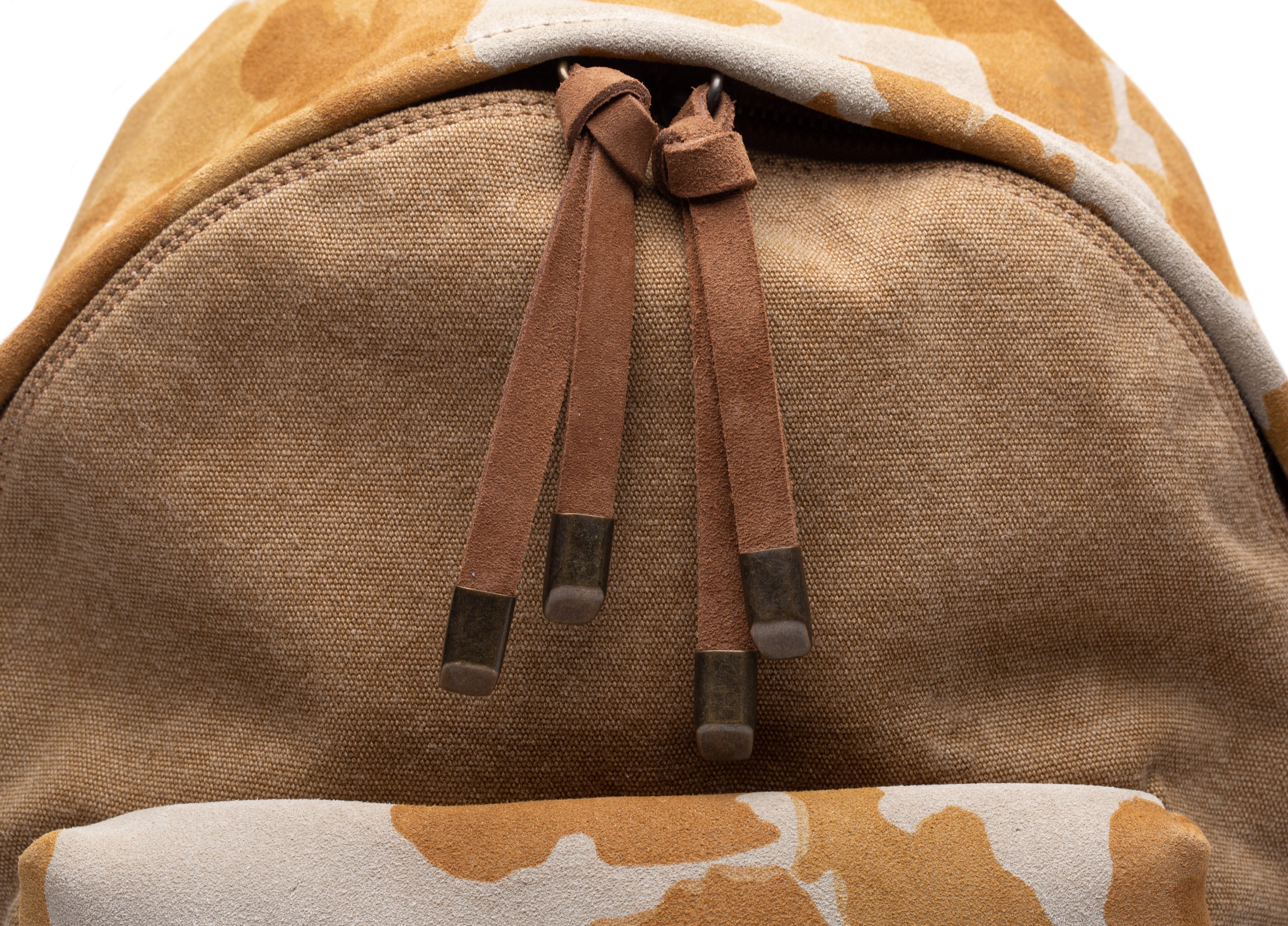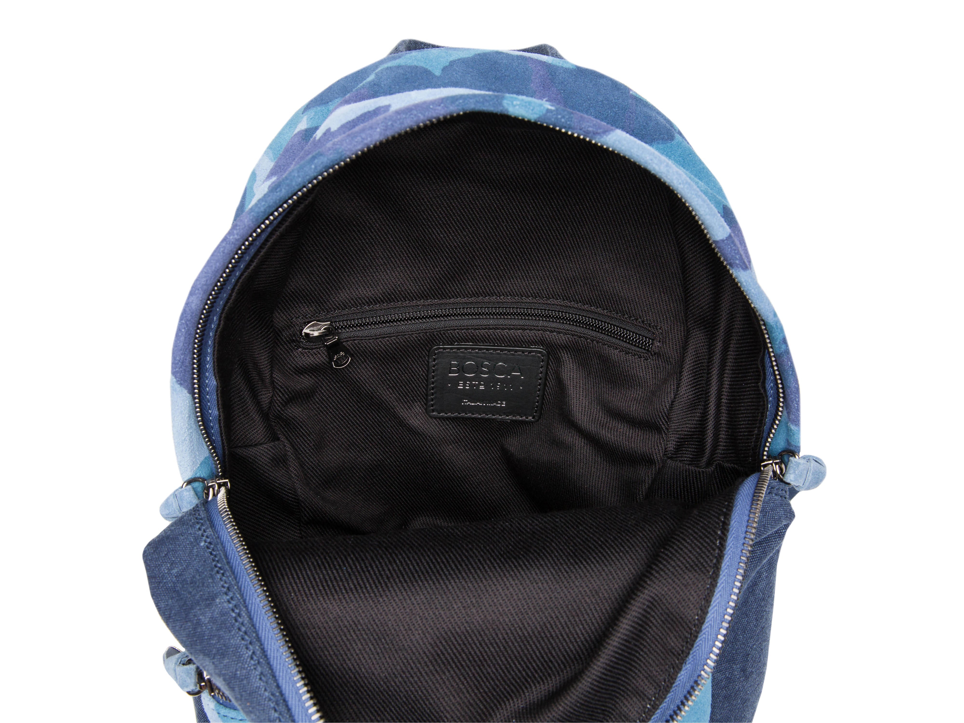 Bosca makes this bag near Florence Italy in a small workshop owned our friends of many (many) years. Every bag is made by hand and touched by a member of the family. The cotton canvas is relaxed but trim-looking and stain resistant. The leather is a soft, suede with a color-fast fun camo print (blue/blue/blue, or tan/tan/grey.) The straps are matching fabric and are designed to allow you to let the bag hang loosely off your shoulder(s) or snug against your back. The construction is soft and squishable, but not entirely slouchy. Smooth-gliding zippers and zip pull ends in a grey-nickel finish provide the accents. There is one secure zipper pocket inside the bag. Super light-weight but big enough to hold a lot of stuff. Will accommodate up to an 11" iPad