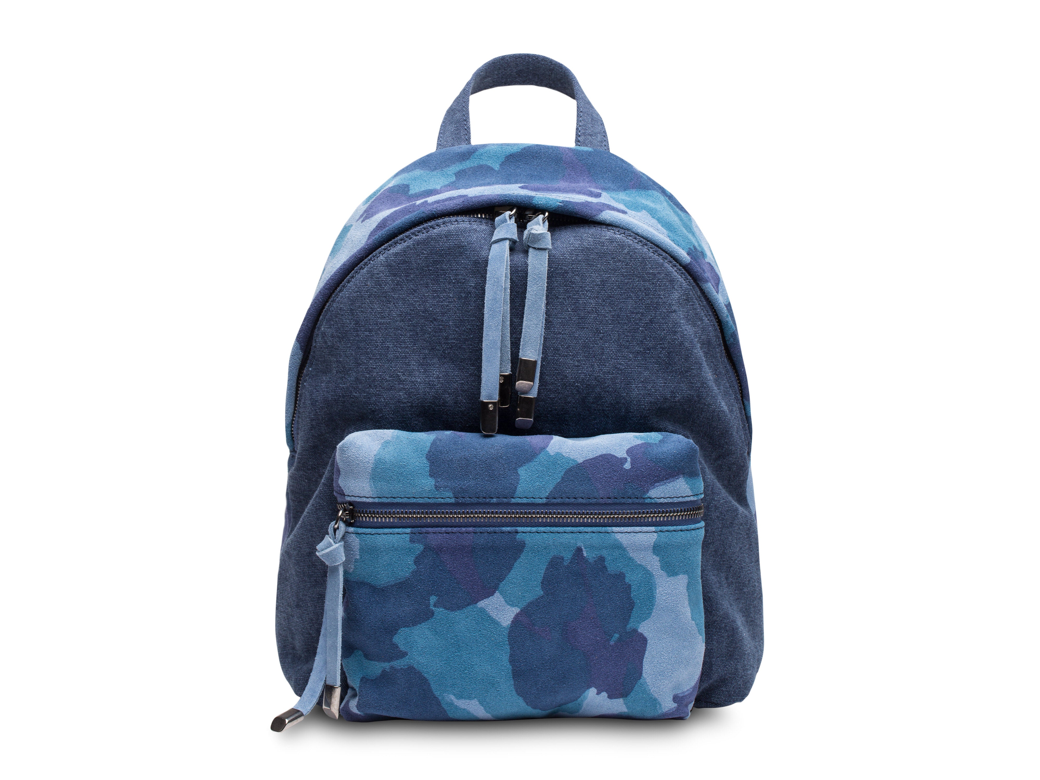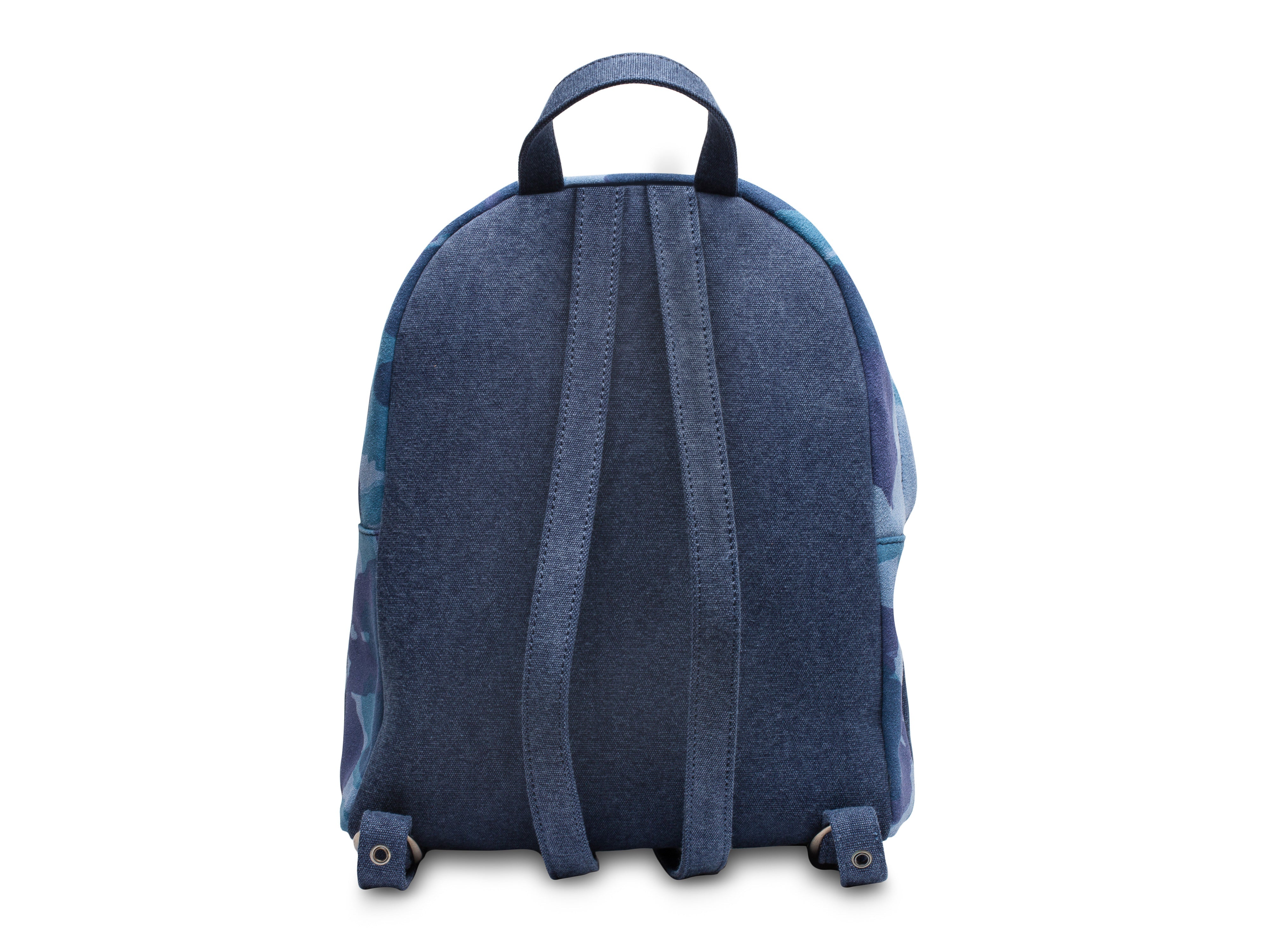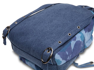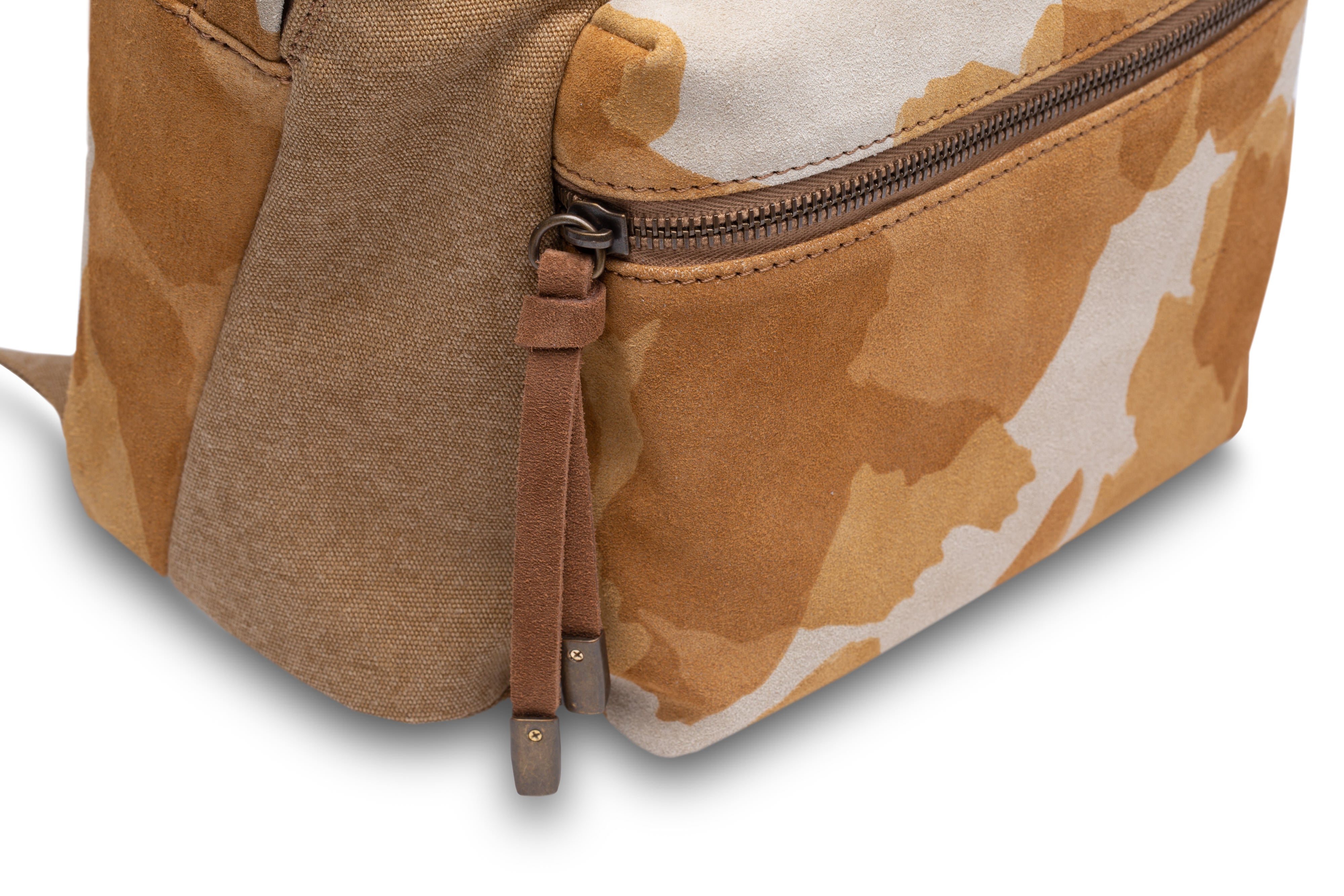 Bosca makes this bag near Florence Italy in a small workshop owned our friends of many (many) years. Every bag is made by hand and touched by a member of the family. The cotton canvas is relaxed but trim-looking and stain resistant. The leather is a soft, suede with a color-fast fun camo print (blue/blue/blue, or tan/tan/grey.) The straps are matching fabric and are designed to allow you to let the bag hang loosely off your shoulder(s) or snug against your back. The construction is soft and squishable, but not entirely slouchy. Smooth-gliding zippers and zip pull ends in a grey-nickel finish provide the accents. There is one secure zipper pocket inside the bag. Super light-weight but big enough to hold a lot of stuff. Will accommodate up to an 11" iPad